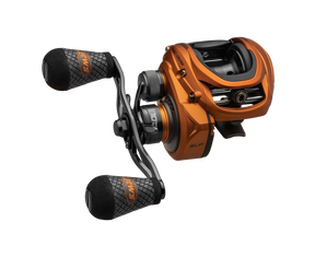 Carrete de casting de la marca Lews modelo Crush en color negro y naranja, especial para la pesca de black-bass y depredadores.