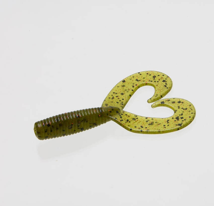 Vinilo con forma de gusano de cuerpo gordo y ondulado con colas gemelar de larva de 90 milímetros de la marca Zoom modelo Fat Albert Twin color verde con pintas rojas y negras. Está impregnado de sal. Contiene acción de giro de cola gemela para mover mucha agua. Las dos colas rizada crean una acción de aleteo y llamada de bajo al golpear el agua. Diseñados para un remolque de jig o como un remolque en un spinnerbait o buzzbait.