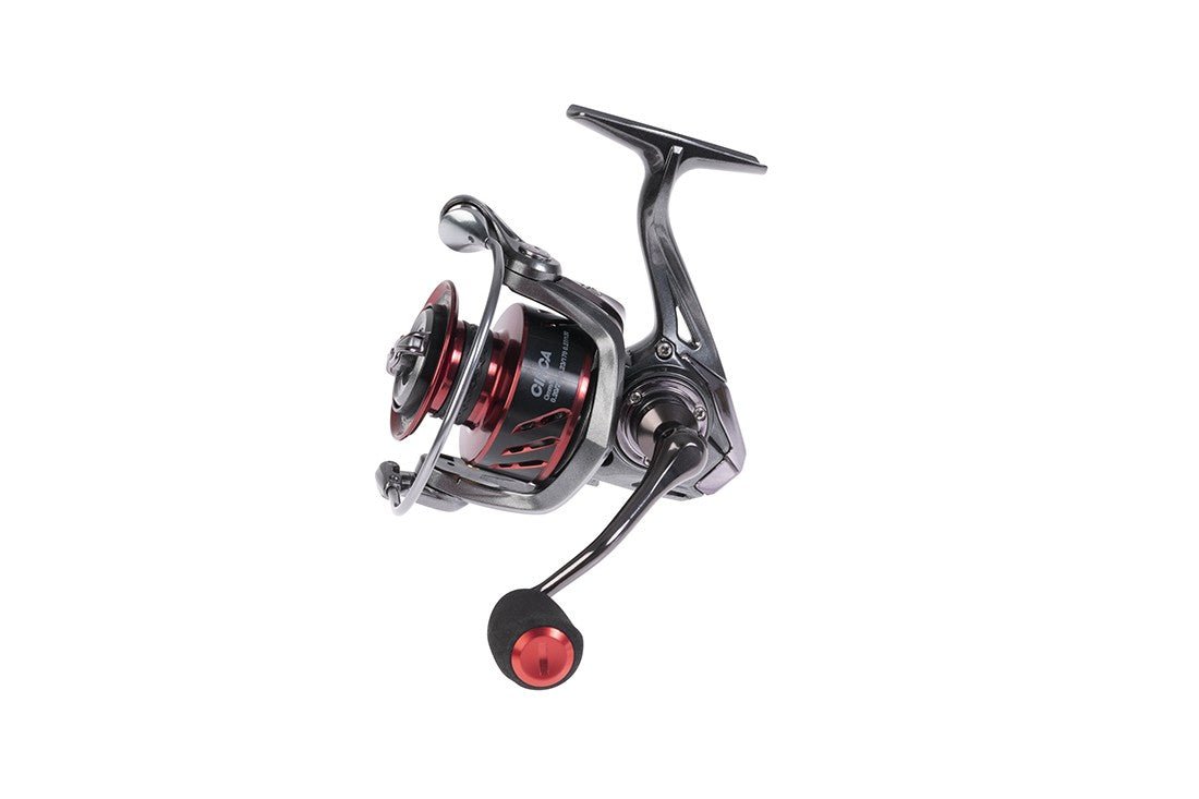 Carrete de spinning de la marca Hart, modelo Circa, en color negro y rojo, especial para la pesca de black bass y depredadores.