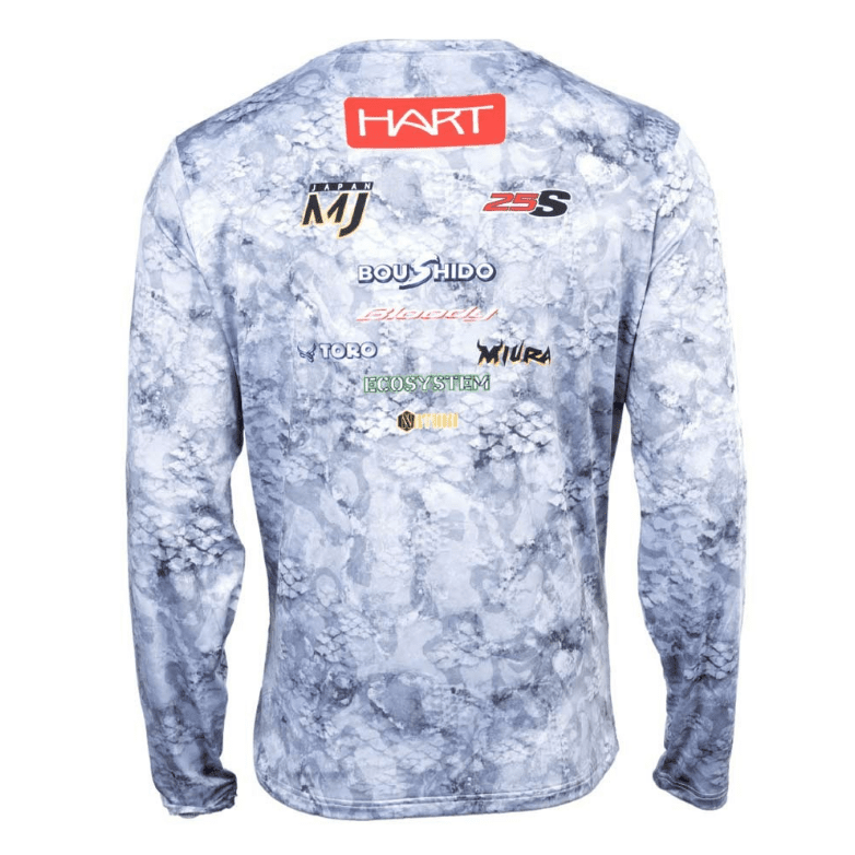 Camiseta técnica de manga larga de la marca Hart modelo Volcano en color blanco y gris, especial para la pesca de black bass y depredadores.