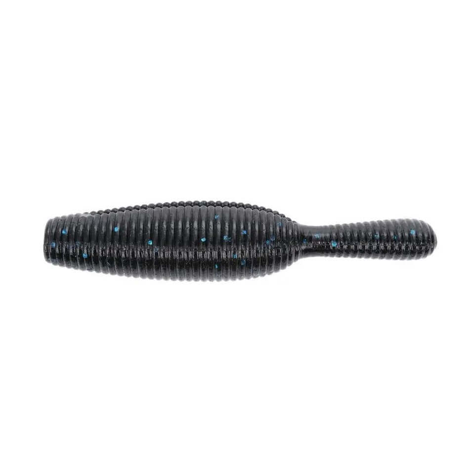 Vinilo con forma de gusano de 63,5 milímetros de la marca Yamamoto modelo Yamatanuki en color negro con pintas azules, especial para la pesca de carpfishing.