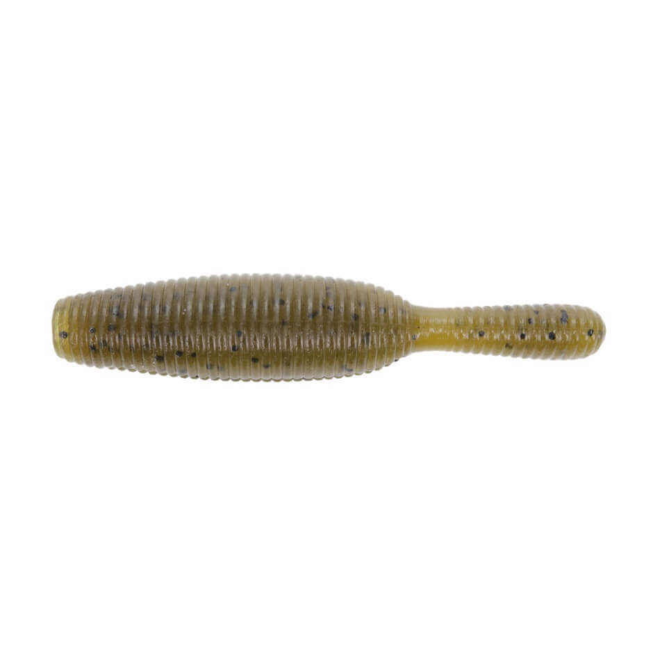 Vinilo con forma de gusano de 63,5 milímetros de la marca Yamamoto modelo Yamatanuki en color verde con pintas negras, especial para la pesca de black bass y depredadores.