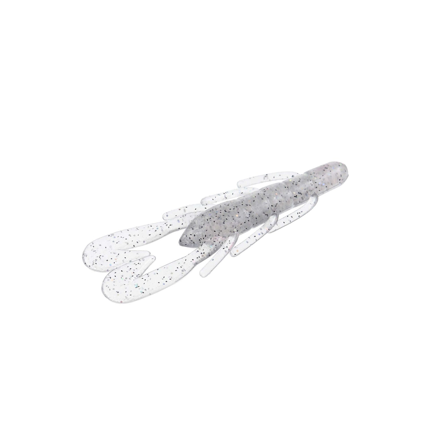Vinilo de la marca Zoom, modelo Micro Ultravibe Speed Craw, en color Natural Shad (blanco y gris con pintas negras), especial para la pesca de Bass y depredadores.