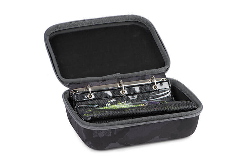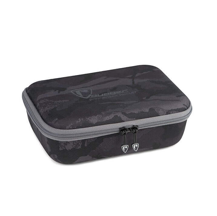 Bolso rígido para spinnerbaits de la marca Fox Rage con diseño camuflaje en color gris y negro, especial para la pesca de bass.