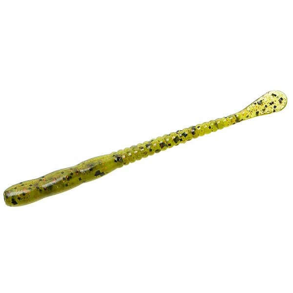 Vinilo fino de 100 milímetros de la marca Zoom modelo Meathead, color verde con pintas negras y rojas, especial para la pesca de bass y depredadores. Está impregnado en sal.