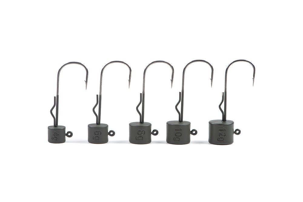 - Disponible en tamaños de anzuelo 2/0 con pesos de 4 g, 6 g, 8 g, 10 g y 12 g