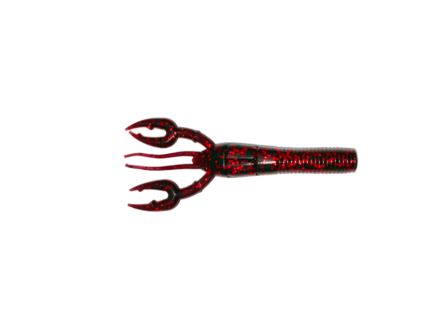 Vinilo con forma de cangrejo de 95 milímetros de la marca Yamamoto modelo Fat Baby Craw, en color negro con pintas rojas, especial para la pesca de Black Bass.