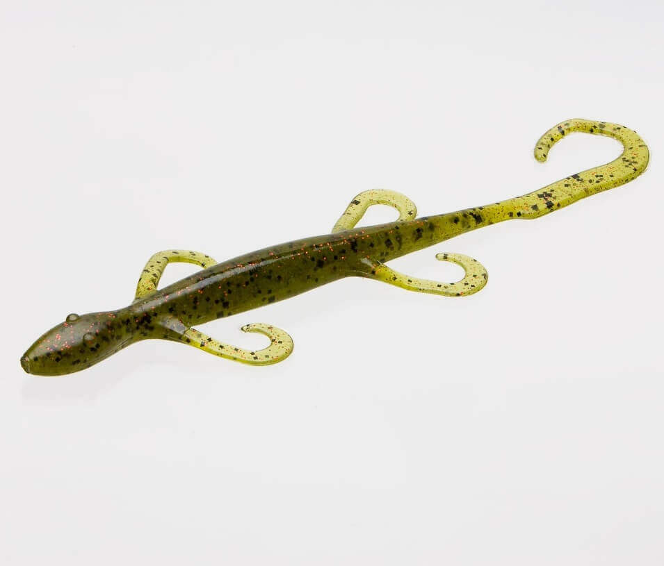 Vinilo con forma de lagarto de 203 milímetros de la marca Zoom modelo Magnum Lizard en color verde con pintas rojas y negras. Es una lagartija de cuerpo delgado con patas que se mueven libremente y cola rizada. Está impregnado de sal.
